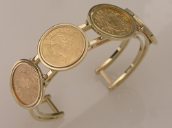 Gold coins on a handmade 14ky gold bracelet